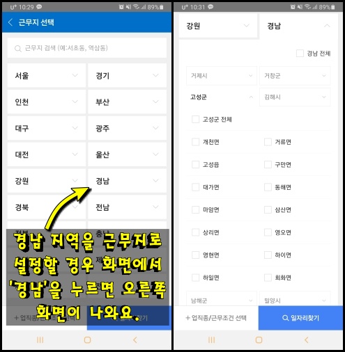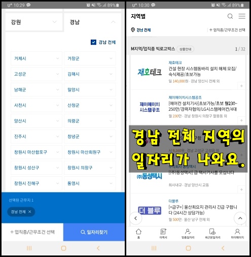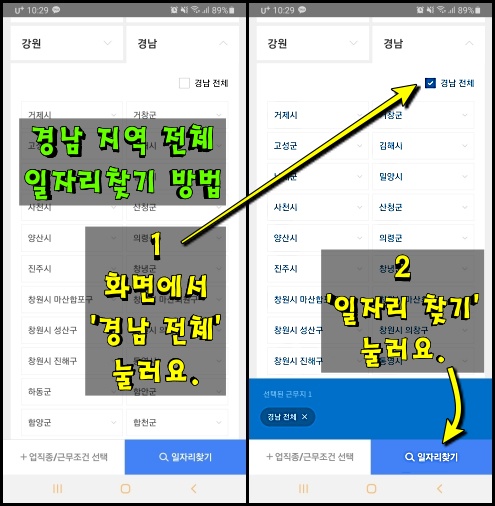 [โ] ๊ฒฝ๋จ์ ์ฒด ์ ํํ๊ณ [์ผ์๋ฆฌ์ฐพ๊ธฐ] ๋๋ฅด๋ฉด ์์ ์ฌ์ง์ฒ๋ผ ๊ฒฝ๋จ ์ ์ฒด ์ง์ญ์ ์ผ์๋ฆฌ(๊ตฌ์ธ๊ตฌ์ง์ฌ์ดํธ) ์ ๋ณด๊ฐ ๋์์.