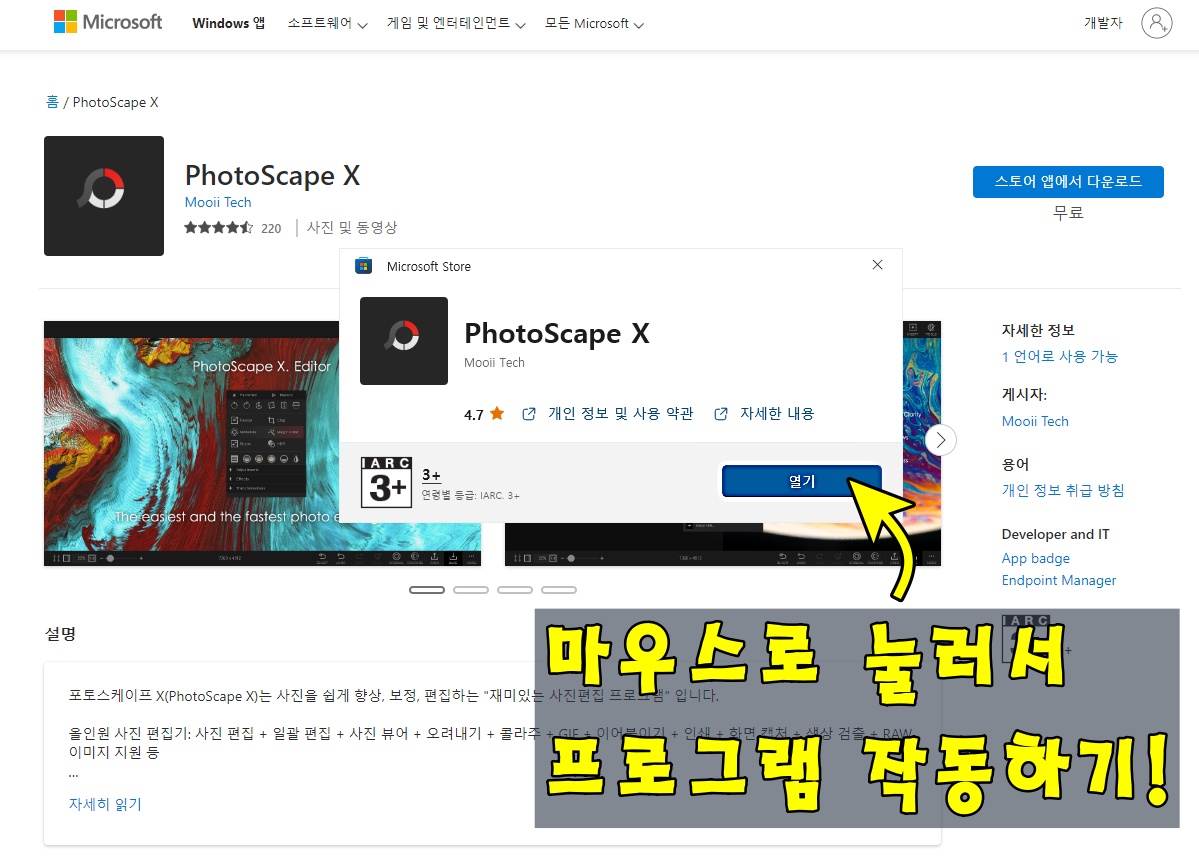 ์๋ ์ ๊ฐ ์ฒจ๋ถํ ์ฌ์ง๊ณผ ๊ฐ์ด ํ๋ฉด ์๋ด์ PhotoSacapeX ๋ฅผ ๋ง์ฐ์ค๋ก ๋๋ฅด๋ฉด ํ์ฐฝ ํ๋ฉด์ด ๋ซํ์.
