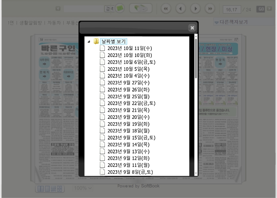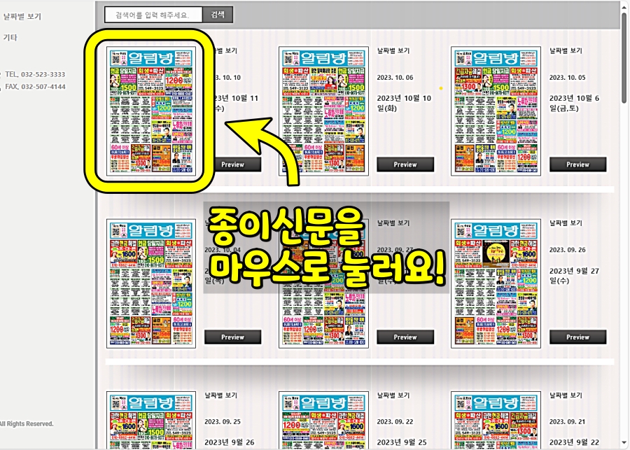 화면을 이동하면 아래와 같이 날짜별로 인천알림방 종이신문 그대로보기 화면을 확인하실 수 있어요.