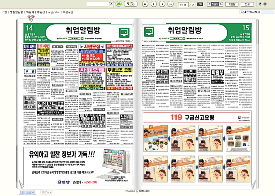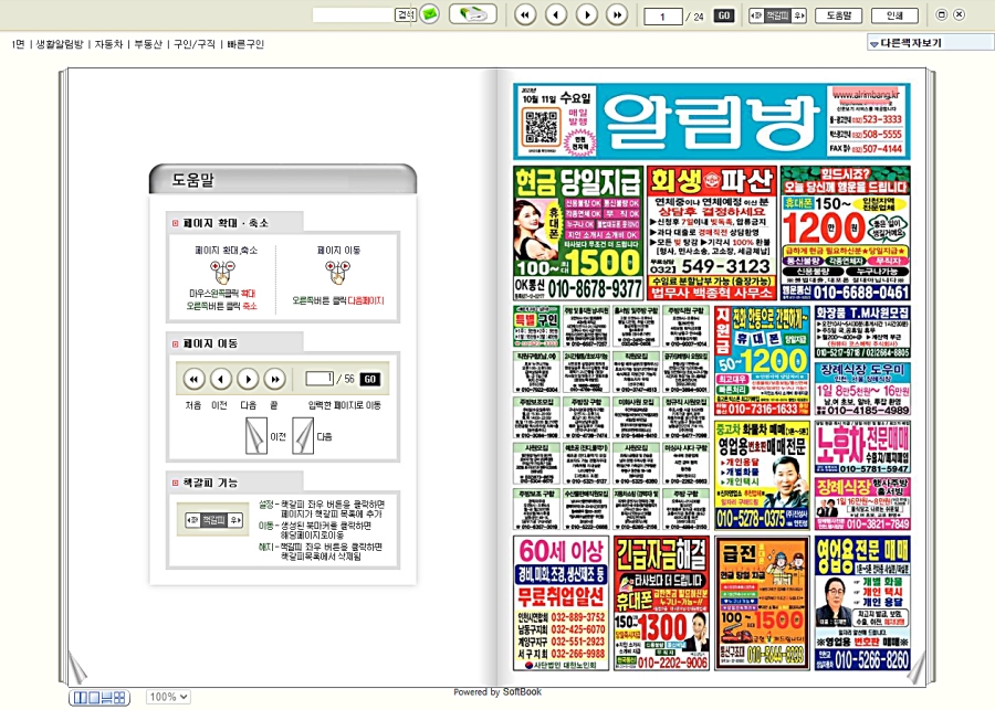 인천알림방 신문 쪽수는 날짜별(일자별)로 차이가 있지만 적게는 대략 16페이지에서 24페이지로 만들어졌는데 페이지를 하나씩 넘기지 않고 목차를 선택해서 페이지로 바로 이동해서 원하는 정보만 확인하실 수 있는데요.