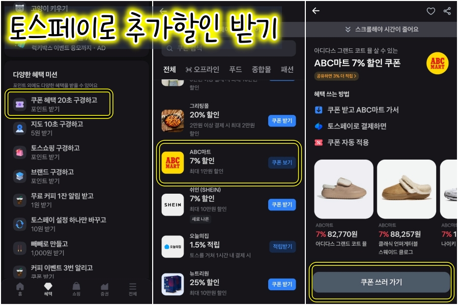 ํ ์ค ์ฑ โถ ํํ โถ ๋ค์ํญ ํํ๋ฏธ์ ๋ด์ ์ฟ ํฐ ํํ 20์ด ๊ตฌ๊ฒฝํ๊ณ (ํฌ์ธํธ ๋ฐ๊ธฐ) โถ ํน๋ณ ํํ ๋ด์ ABC๋งํธ 17% ํ ์ธ ์ฟ ํฐ ์ฐพ์์ ํด๋ฆญํ์ฌ ABC๋งํธ ํ๊ณ ๋ค์ด๊ฐ์ ์ํ์ ํ์ธํด์. ์ต์ข ๊ฒฐ์ ์ ํ ์คํ์ด ์ ํํ๋ฉด ํ ์คํ์ด ๊ฒฐ์ ์ ์๋์ผ๋ก ์ฟ ํฐ ์ ์ฉํ์ฌ ์ต์ข ๊ธ์ก ํ์ธํ ์ ์์ด์.
