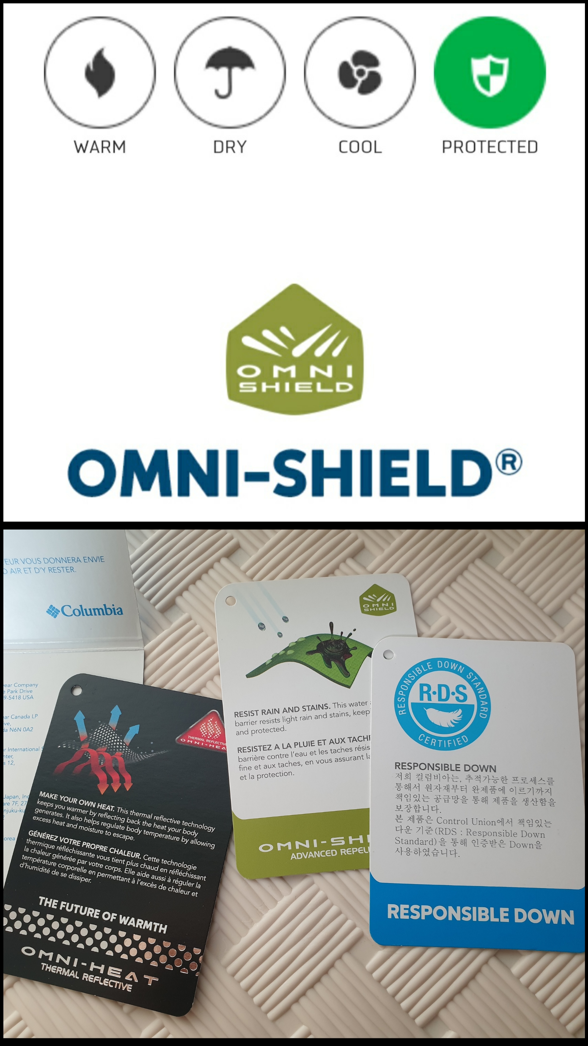 ๋ฌด๊ด์ ๊ธฐ๋ณธ ๋์์ธ์ผ๋ก ์ ์์ ์ฃผ๋จธ๋์ ์งํผ๊ฐ ์๊ณ , ์ข์ธก ์๋จ์ columbia ๋ธ๋๋ ๋ก๊ณ , ์ข์ธก ์๋งค์๋ OMNI-HEAT(์ด๋ํํธ) ๋งํฌ๊ฐ ์์ด์.