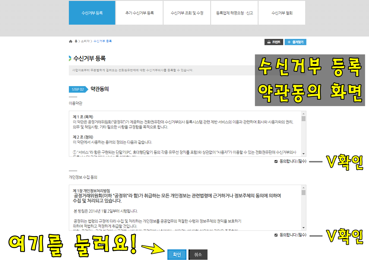์์ ๊ฑฐ๋ถ ๋ฑ๋ก์ ๋ํ ์ฝ๊ด๋์, ๊ฐ์ธ์ ๋ณด์์ง๋์ ๋ด์ฉ์ ํ์ธ ํ ๋ชจ๋ โ๋์ํฉ๋๋ค(ํ์)โ์ ์ฒดํฌํ๊ณ , ํ๋ฉด ์ค์ ์๋์์ ๋ชจ๋ ๋ด์ฉ์ ํ์ธํ์๋ค๋ [ํ์ธ]์ ๋ง์ฐ์ค๋ก ๋๋ฌ์.
